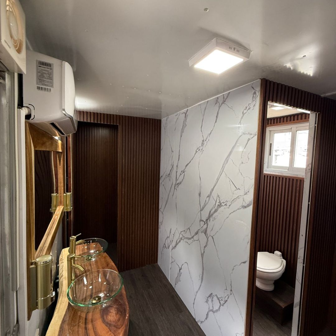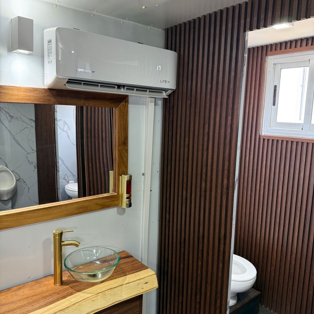 Nuestro modelo más exclusivo. Este remolque está diseñado para brindar una experiencia sanitaria tipo «restaurante de alta gama». Divide el espacio en dos áreas totalmente independientes: una para mujeres y otra para hombres, ambas equipadas con amenidades completas, acabados elegantes y aire acondicionado. Es la opción ideal cuando el confort, la capacidad y la presentación importan.